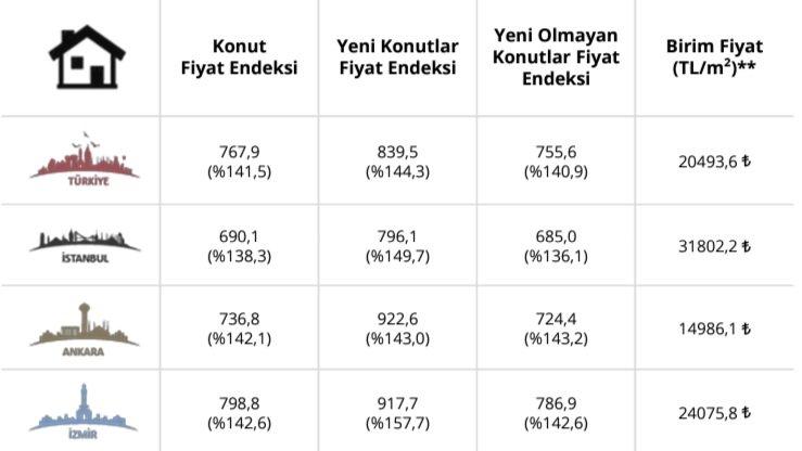 Bu arada Merkez Bankası, büyük deprem felaketinin yaşandığı şubat ayına ilişkin Konut Fiyat Endeksi (KFE) verilerini açıkladı. Buna göre, ülke genelinde konut fiyatları şubatta yıllık yüzde 141,5 arttı. Aylık bazda ise yüzde 8,4 yükselerek son 8 ayın en yüksek aylık artışını kaydetti. 100 metrekare bir evin ortalama fiyatı ülke genelinde ilk kez 2 milyon TL’yi aşarken, İstanbul’da ise ilk kez 3 milyon TL’yi gördü. İzmir’de konut fiyatları yüzde 142,6 ile ülke ortalamasının üzerinde artarken, bu oran Ankara’da yüzde 142,1 ve İstanbul’da yüzde 138,3 oldu.