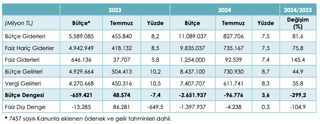Ocak-temmuz döneminde merkezi yönetim bütçe giderleri 5 trilyon 406,3 milyar TL, bütçe gelirleri 4 trilyon 562,3 milyar TL ve bütçe açığı 844 milyar TL oldu. Faiz dışı bütçe giderleri 4 trilyon 739,3 milyar TL ve faiz dışı açık ise 177 milyar TL olarak gerçekleşti. Ocak-temmuz dönemi vergi gelirleri tahsilatı geçen yılın aynı dönemine göre yüzde 86,4 oranında artarak 3 trilyon 825 milyar 106 milyon TL oldu.