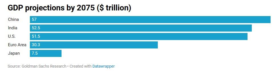 Goldman Sachs’ın öngörüsüne göre, 2075 yılında Çin 57 milyar dolarlık GSYH’siyle ABD’yi sollayarak birinci sıraya yükselecek. Hindistan da 52.5 milyar dolarlık GSYH ile ABD’yi geçerek ikinciliği kapacak.