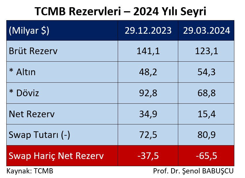 10Haber yazarı, değerli bankacı ve akademisyen Şenol Babuşcu önceki gün sosyal medyasında 2024 yılında Merkez Bankası rezervlerinden 28 milyar dolar daha satıldığını belirterek şu tabloyu paylaştı: