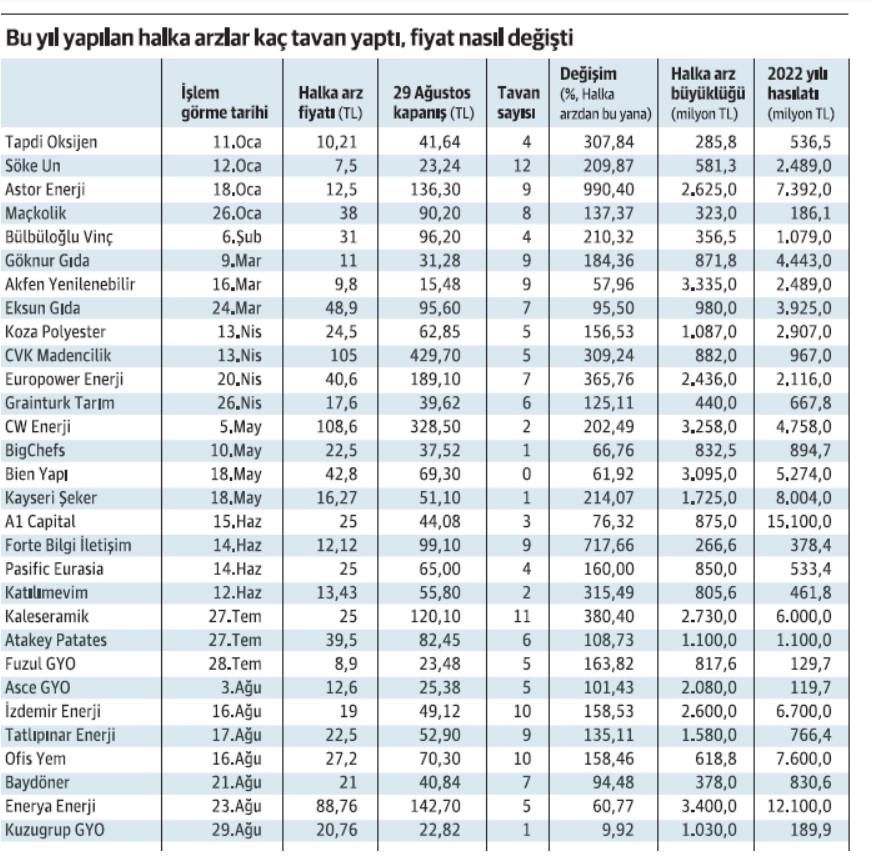 Ağustos sonuna kadar halka arz edilen 30 şirketin toplam halka arz büyüklüğü 42 milyar 245 milyon lira olurken son üç ayda halka arz olan 14 şirketin toplam halka arz büyüklüğü ise 19 milyar 131 milyon lira oldu. 8 ayda halka arz edilen şirketlerin yarısı son üç ayda halka arz oldu. Ve cumhurbaşkanlığı seçimleri öncesine göre ise halka arz hisselerin tavan serileri daha belirgin hale geldi.