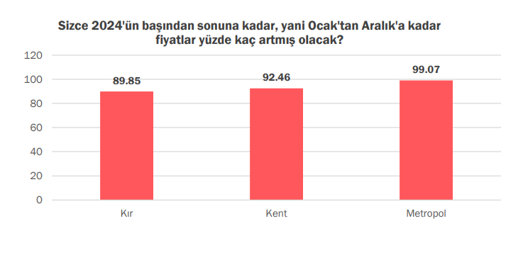Ankette bireylerin yaşadığı yerleşim tiplerine göre kır, kent ve metropol şeklinde bir ayrıştırma yapıldığında kırdan metropol alanlarına doğru gittikçe fiyat artışı beklentisinin yükseldiği gözlemlendi. Kırda yaşayanların fiyat artışı beklentisi yüzde 89,85 olurken bu oran kentte yüzde 92,46’ya metropolde ise 99,07 olarak ölçüldü.