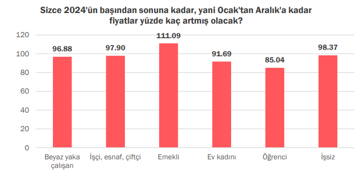 Görüşülen kişilerin çalışma durumuna göre bir inceleme yapıldığında ise enflasyon beklentisi en yüksek olan grup emekliler oldu. Emekli grubunu işsizler takip etti. Emeklinin enflasyon beklentisi yüzde 111,09 olurken işsizlerin enflasyon beklentisi yüzde 98,37 oldu. İşçi, esnaf ve çiftçi grubunda ise beklenti yüzde 96,88 oldu.