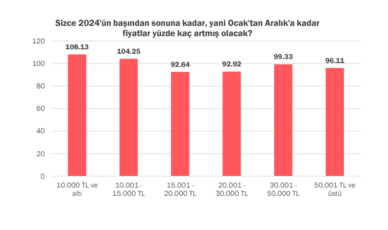 Haneye giren toplam gelir beyanına göre bir gruplama yapıldığında ise düşük gelir seviyeleri için gelir düştükçe yılsonu enflasyon beklentisinin yükseldiği gözlendi. 10 bin TL altı maaş alan grubun enflasyon beklentisi 108,13 olurken, 10 bin-15 bin arası gelire sahip kişilerin enflasyon beklentisi 104,25 oldu.