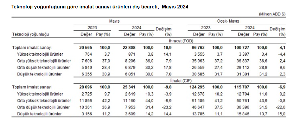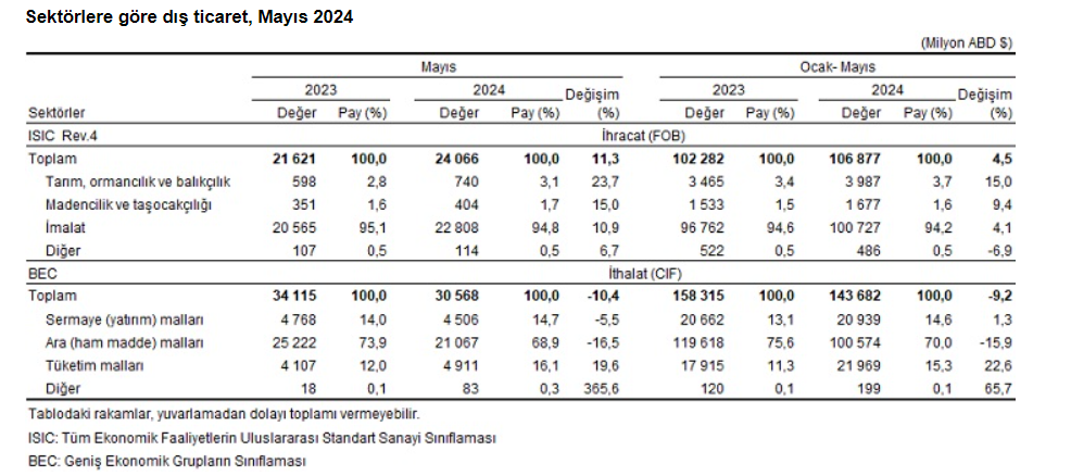 Ekonomik faaliyetlere göre ihracatta, 2024 Mayıs ayında imalat sanayinin payı yüzde 94,8, tarım, ormancılık ve balıkçılık sektörünün payı yüzde 3,1, madencilik ve taşocakçılığı sektörünün payı yüzde 1,7 oldu. Ocak-mayıs döneminde ekonomik faaliyetlere göre ihracatta imalat sanayinin payı yüzde 94,2, tarım, ormancılık ve balıkçılık sektörünün payı yüzde 3,7, madencilik ve taşocakçılığı sektörünün payı yüzde 1,6 oldu. Geniş ekonomik gruplar sınıflamasına göre ithalatta, 2024 Mayıs ayında ara mallarının payı yüzde 68,9, sermaye mallarının payı yüzde 14,7 ve tüketim mallarının payı yüzde 16,1 oldu. İthalatta, 2024 Ocak-Mayıs döneminde ara mallarının payı yüzde 70,0, sermaye mallarının payı yüzde 14,6 ve tüketim mallarının payı yüzde 15,3 oldu. Yüksek teknolojili ürünlerin imalat sanayi ihracatı içindeki payı da yüzde 3,8 oldu.