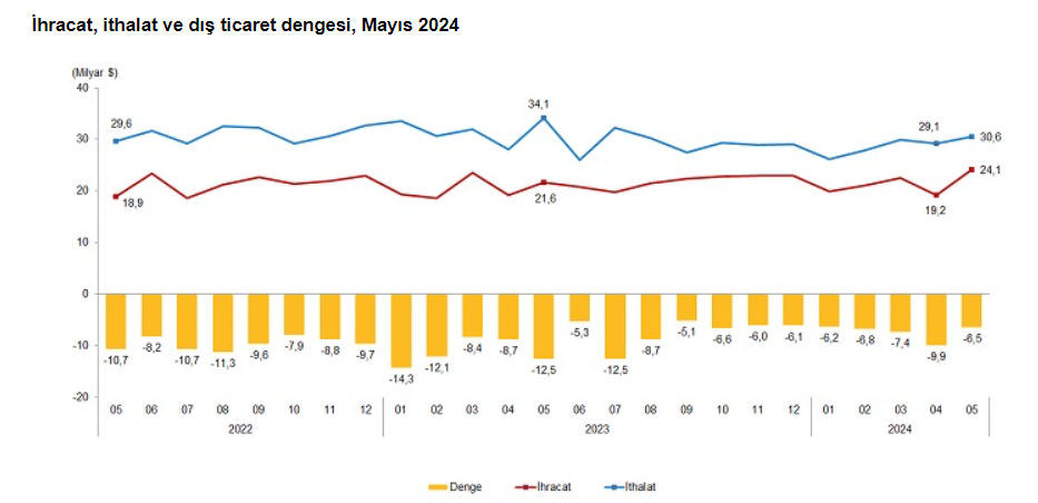 Genel ticaret sistemine göre ihracat 2024 yılı Ocak-Mayıs döneminde bir önceki yılın aynı dönemine göre yüzde 4,5 artarak 106 milyar 877 milyon dolar, ithalat yüzde 9,2 azalarak 143 milyar 682 milyon dolar olarak gerçekleşti. Enerji ürünleri ve parasal olmayan altın hariç ihracat, 2024 Mayıs ayında yüzde 9,2 artarak 20 milyar 112 milyon dolardan, 21 milyar 969 milyon dolara yükseldi.