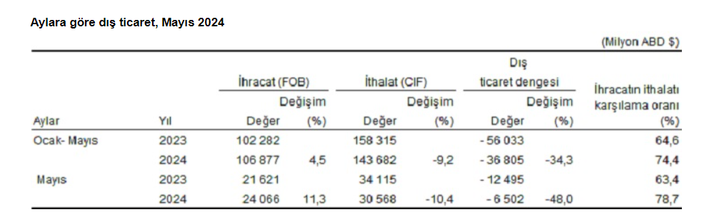 Türkiye İstatistik Kurumu ile Ticaret Bakanlığı iş birliğiyle genel ticaret sistemi kapsamında üretilen geçici dış ticaret verilerine göre; ihracat 2024 yılı Mayıs ayında, bir önceki yılın aynı ayına göre yüzde 11,3 artarak 24 milyar 66 milyon dolar, ithalat yüzde 10,4 azalarak 30 milyar 568 milyon dolar olarak gerçekleşti.