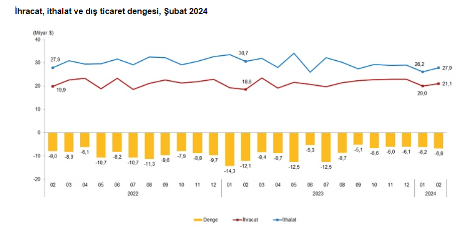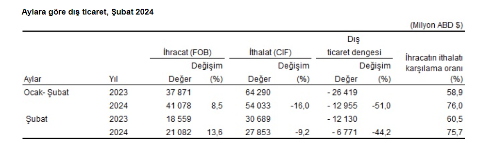 Genel ticaret sistemine göre ihracat 2024 yılı Ocak-Şubat döneminde bir önceki yılın aynı dönemine göre yüzde 8,5 artarak 41 milyar 78 milyon dolar, ithalat yüzde 16,0 azalarak 54 milyar 33 milyon dolar olarak gerçekleşti. Mevsim ve takvim etkilerinden arındırılmış seriye göre 2024 Şubat ayında bir önceki aya göre ihracat yüzde 2,1 ithalat yüzde 4,9 arttı. Takvim etkilerinden arındırılmış seriye göre ise 2024 yılı Şubat ayında bir önceki yılın aynı ayına göre ihracat yüzde 10,2 artarken, ithalat yüzde 12,7 azaldı.