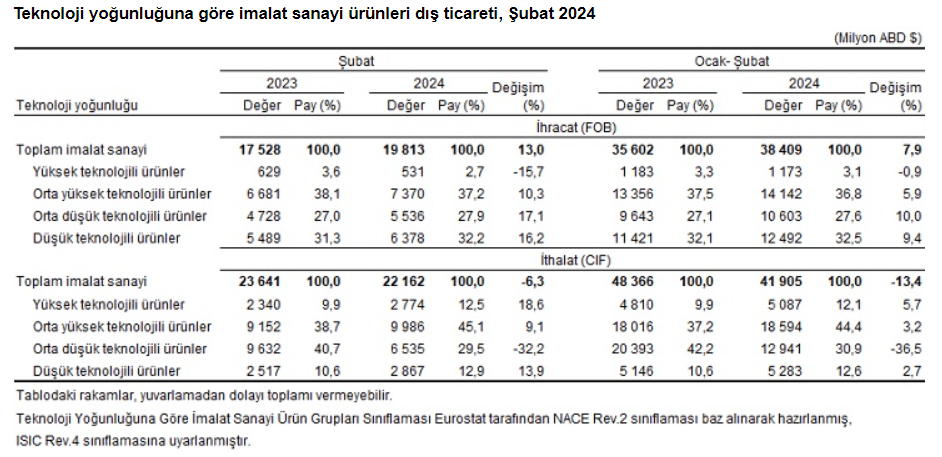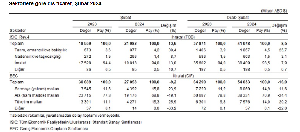 İthalatta tüketim mallarının payı artıyorEkonomik faaliyetlere göre ihracatta, 2024 Şubat ayında imalat sanayinin payı yüzde 94,0, tarım, ormancılık ve balıkçılık sektörünün payı yüzde 4,2, madencilik ve taşocakçılığı sektörünün payı yüzde 1,4 oldu. Ocak-şubat döneminde ekonomik faaliyetlere göre ihracatta imalat sanayinin payı yüzde 93,5, tarım, ormancılık ve balıkçılık sektörünün payı yüzde 4,5, madencilik ve taşocakçılığı sektörünün payı yüzde 1,5 oldu. Geniş ekonomik gruplar sınıflamasına göre ithalatta, 2024 Şubat ayında ara mallarının payı yüzde 68,8, sermaye mallarının payı yüzde 15,8 ve tüketim mallarının payı yüzde 15,3 oldu. İthalatta, 2024 Ocak-Şubat döneminde ara mallarının payı yüzde 70,9, sermaye mallarının payı yüzde 14,9 ve tüketim mallarının payı yüzde 14,0 oldu