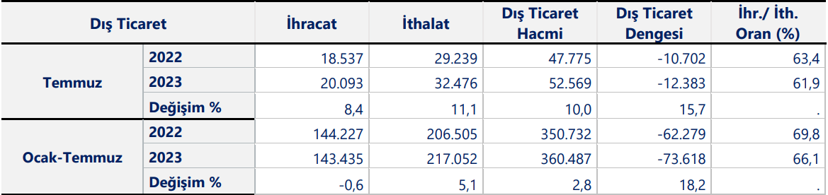 2023 Temmuz’unda ihracatın ithalatı karşılama oranı geçen yılın aynı ayına göre 1,5 puan azalarak yüzde 61,9 olarak gerçekleşti. Enerji verileri hariç tutulduğunda, ihracatın ithalatı karşılama oranı 9,7 puan azalarak yüzde 68,8 oldu. Enerji ve altın verileri hariç tutulduğunda ise, ihracatın ithalatı karşılama oranı 9,6 puan azalarak yüzde 75,5 olarak gerçekleşti.