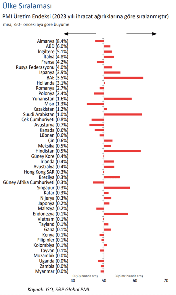 “Küresel ekonomide büyümenin giderek daha genele yayılı bir hale gelmesiyle, Türkiye’nin imalat sanayi ihracatı açısından önemli konumda bulunan pazarların büyük bir bölümünde satış fırsatları genişliyor. Sadece Almanya ve Fransa bu trendin gerisinde kalmış durumda. Dolayısıyla önümüzdeki aylarda Türkiye’deki firmalar dış talep koşullarının güçlenmesi bakımından bu iki ülkenin de toparlanma belirtileri göstermesini ümit edecektir.”