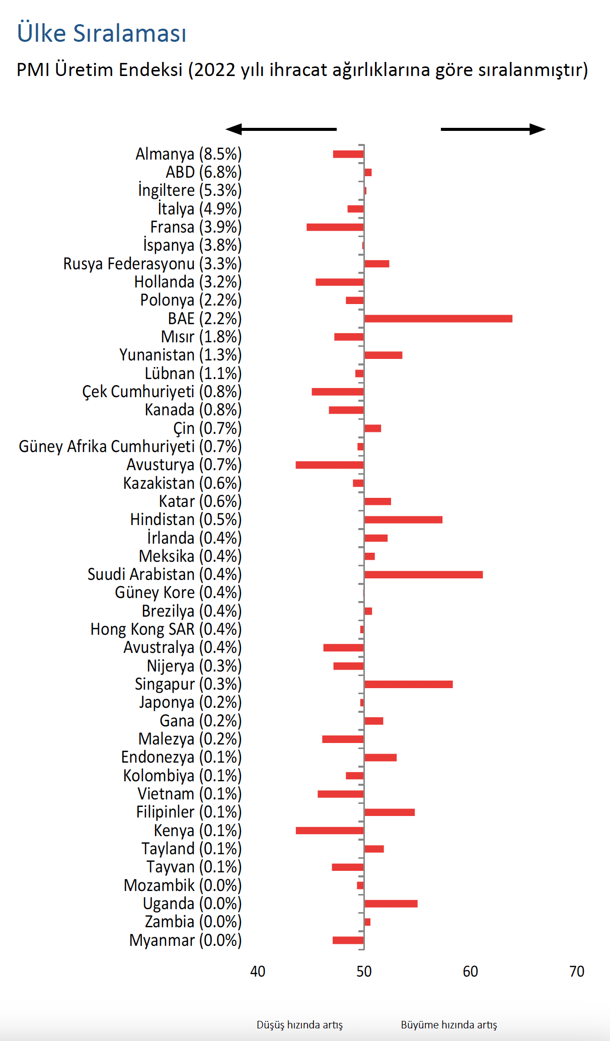 İhracatçıların işini zorlaştıran ekonomik aktivitedeki düşüşler kasım ayında ağırlıklı olarak Euro Bölgesi’nde gerçekleşti. Almanya, İtalya, Fransa, İspanya ve Hollanda’da ekonomik aktivite daraldı. Diğer taraftan, söz konusu ekonomilerin genelinde küçülmeler ekim ayına göre yavaşladı. Bu durumun tek istisnası olan İspanya’da ise üretim bir önceki anket döneminde yatay seyrettikten sonra kasımda düşüş gösterdi. Türk imalatçılarının üçüncü en büyük ihracat pazarı olan Birleşik Krallık’ta da iyileşme işaretleri görüldü. Bu ülkede üretimde üç aylık düşüş eğilimi bitti ve hafif bir artış görüldü.
