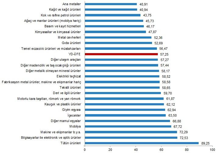 YD-ÜFE sektörlerinden ana metaller yüzde 40,91, kağıt ve kağıt ürünleri yüzde 40,94, kok ve rafine petrol ürünleri yüzde 43,75 ile endekslerin en az arttığı alt sektörler oldu. Buna karşılık tütün ürünleri yüzde 89,25, bilgisayarlar ile elektronik ve optik ürünler yüzde 72,53, b.y.s. makine ve ekipmanlar yüzde 72,29 ile endekslerin en fazla arttığı alt sektörler oldu.