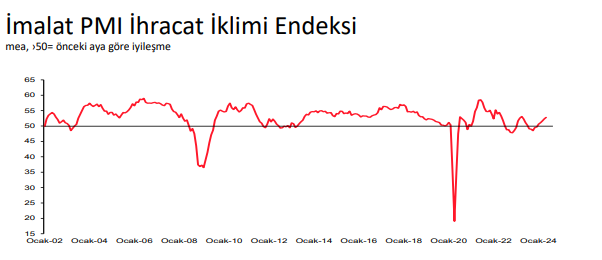 Endeks ihracat pazarlarında talep koşullarının aylık bazda belirgin bir şekilde güçlendiğine işaret ederken iyileşme üst üste dört ay hızlanarak Nisan 2023’ten bu yana en yüksek oranda gerçekleşti. Türkiye’nin imalat sanayi ihracatındaki yüzde 8’e yakın payıyla en büyük dış pazar konumunda bulunan Almanya’nın ekonomik aktivitesi mayısta son bir yıldır ilk kez büyüme gösterdi. İtalya, İspanya ve Hollanda gibi diğer önemli Euro Bölgesi ekonomilerinde de üretim genişleme eğilimini sürdürdü.