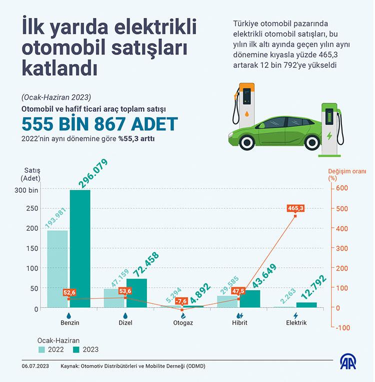 Elektrikli otomobil satışları ise 12 bin 792 adetle otogazlı otomobil satışlarının çok üzerinde gerçekleşti. Geçen yılın ocak-haziran döneminde 2 bin 263 elektrikli otomobil satılmıştı. Benzinli otomobil satışları, bu yılın ilk yarısında 2022’in aynı dönemine göre yüzde 52,6, dizel otomobil satışları da yüzde 53,6 artarken, otogazlı otomobil satışları yüzde 7,6 geriledi. Bu dönemde hibrit otomobil satışları yüzde 47,5 ve elektrikli otomobil satışları da yüzde 465,3 artış kaydetti.