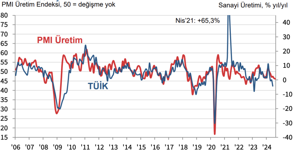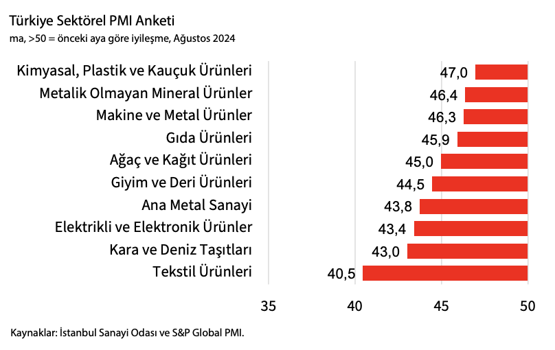 İstanbul Sanayi Odası Türkiye Sektörel PMI raporuna göre ağustos ayında, iki yıldan biraz uzun bir süredir ilk kez, takip edilen on sektörün tamamında üretim düştü. Üretimde en sert düşüş tekstil ürünlerinde görüldü. İstihdam on sektörden sekizinde azalırken kimyasal, plastik ve kauçuk ile makine ve metal ürünleri bu eğilimin istisnaları oldu. İmalatçılar genel olarak yurt dışı müşterilerden yeni iş almakta da zorlandı. Bu alanda iyileşmenin görüldüğü tek sektör , yeni ihracat siparişlerinin son sekiz ayda ilk kez arttığı elektrikli ve elektronik ürünler oldu.
