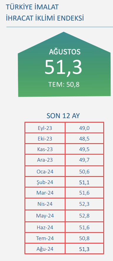 İstanbul Sanayi Odası Türkiye İmalat Sektörü İhracat İklimi Endeksi sekizinci ayda da 50 eşik değerinin üstünde kaldı. Endeks Ağustos’ta 51,3 olarak gerçekleşti.
