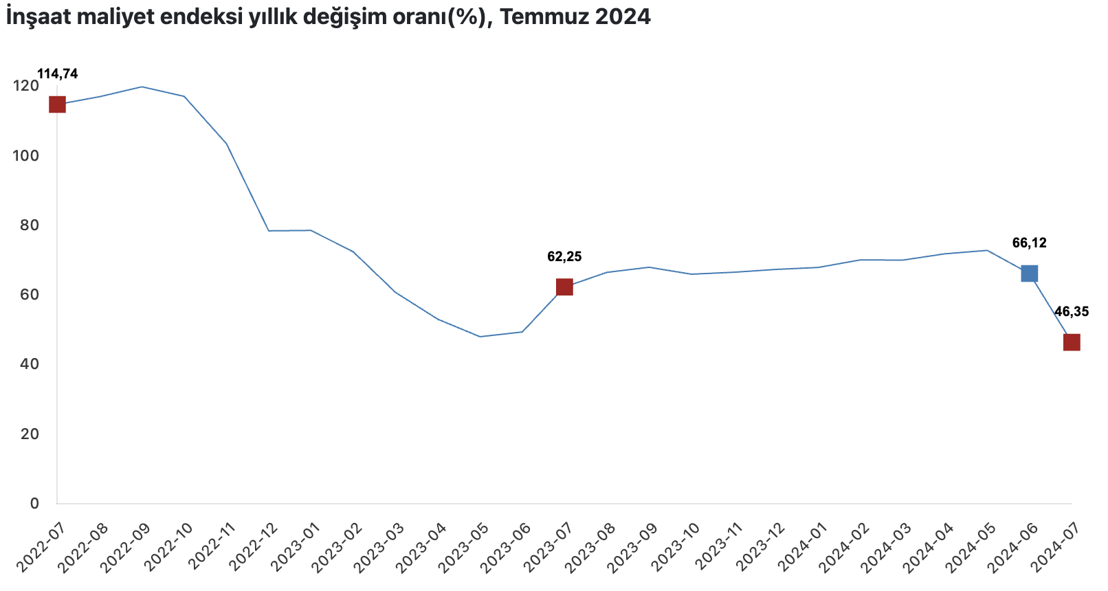İnşaat müteahhitleri son üç yıldır yüksek ücretler ödeseler bile işçi bulamamaktan yakınıyorlar. İnşaat maliyet endeksinde mayıs ayında başlayan düşüş sürüyor. Endeks 2024 yılı Temmuz ayında Hazine ve Maliye Bakanı Mehmet Şimşek’in “geçici nedenlere” bağladığı yüzde 3,23’lük zıplamanın hayli altında yüzde 1,91 artarken yıllık bazda da enflasyonun gerisinde kaldı. İnşaat maliyet endeksi temmuzda bir önceki yılın aynı ayına göre yüzde 46,35 arttı. Bu dönemde tüketici fiyat artışı yüzde 61,78 olmuştu. Bir önceki aya göre malzeme endeksi yüzde 2,12, işçilik endeksi yüzde 1,49 arttı. Ayrıca bir önceki yılın aynı ayına göre malzeme endeksindeki artış yüzde 41,01, işçilik endeksindeki artış ise yüzde 58,40 oldu.