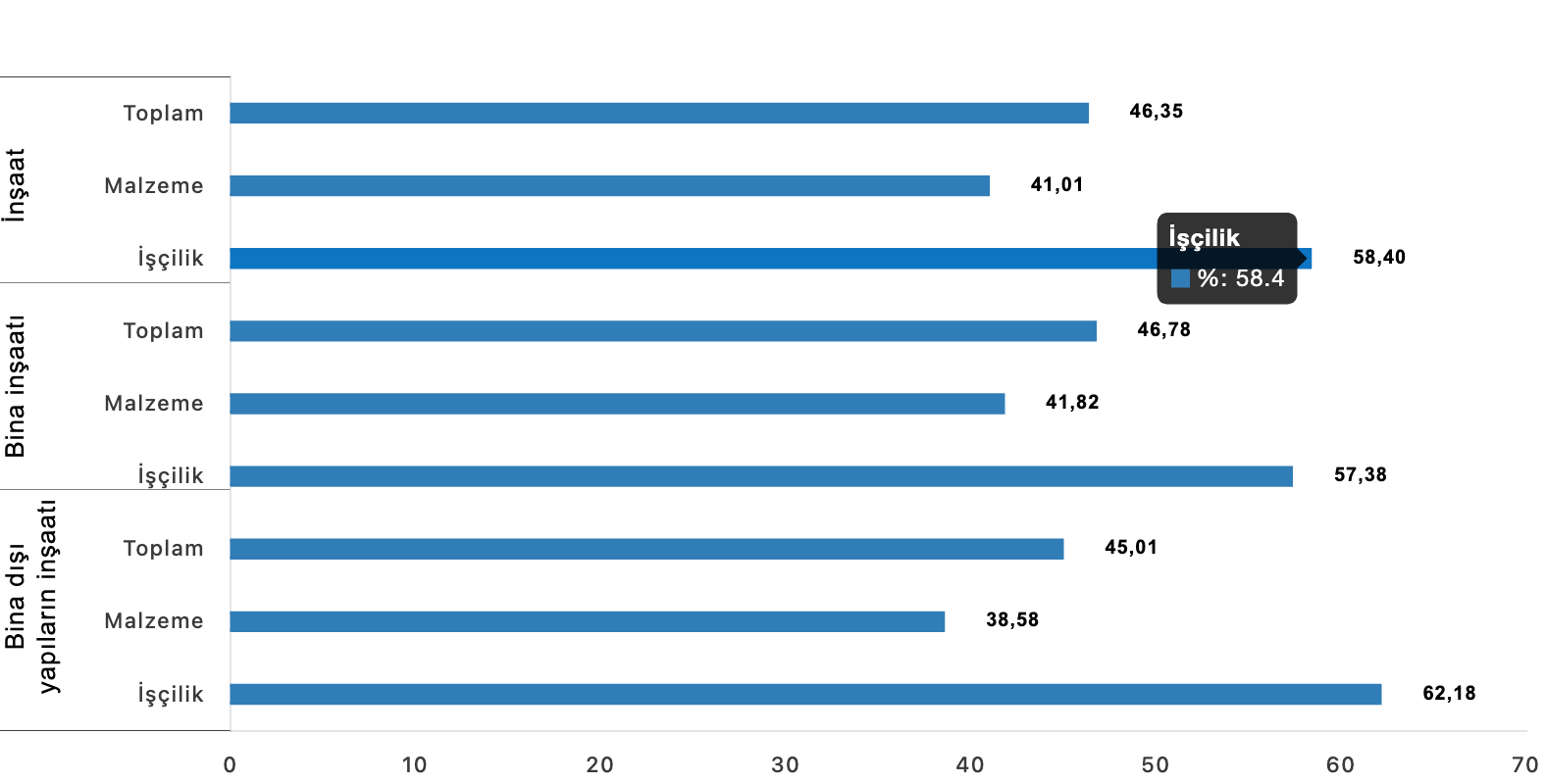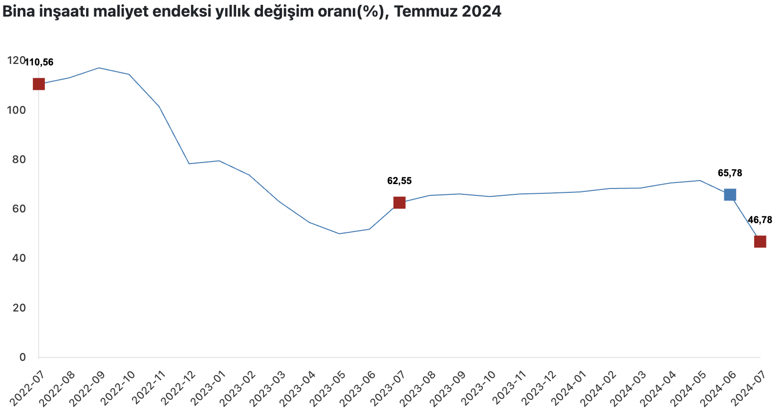 Bina inşaatı maliyet endeksi bir önceki aya göre yüzde 1,53, bir önceki yılın aynı ayına göre yüzde 46,78 arttı. Bir önceki aya göre malzeme endeksi yüzde 1,69, işçilik endeksi yüzde1,24 arttı. Ayrıca bir önceki yılın aynı ayına göre malzeme endeksindeki artış yüzde 41,82, işçilik endeksindeki artış yüzde 57,38 oldu.