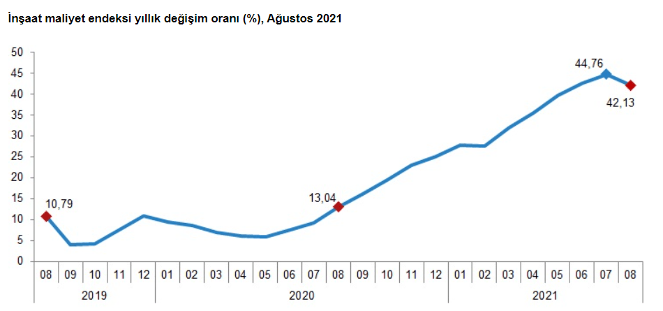 Bina inşaatı maliyet endeksi, bir önceki aya göre yüzde 4,09, bir önceki yılın aynı ayına göre yüzde 65,48 artış kaydetti. Bina inşaat maliyeti içinde malzeme endeksi bir önceki aya göre yüzde 5,15, işçilik endeksi yüzde 1,83 arttı. Ayrıca bir önceki yılın aynı ayına göre malzeme endeksi yüzde 50,28, işçilik endeksi yüzde 113,11 arttı.