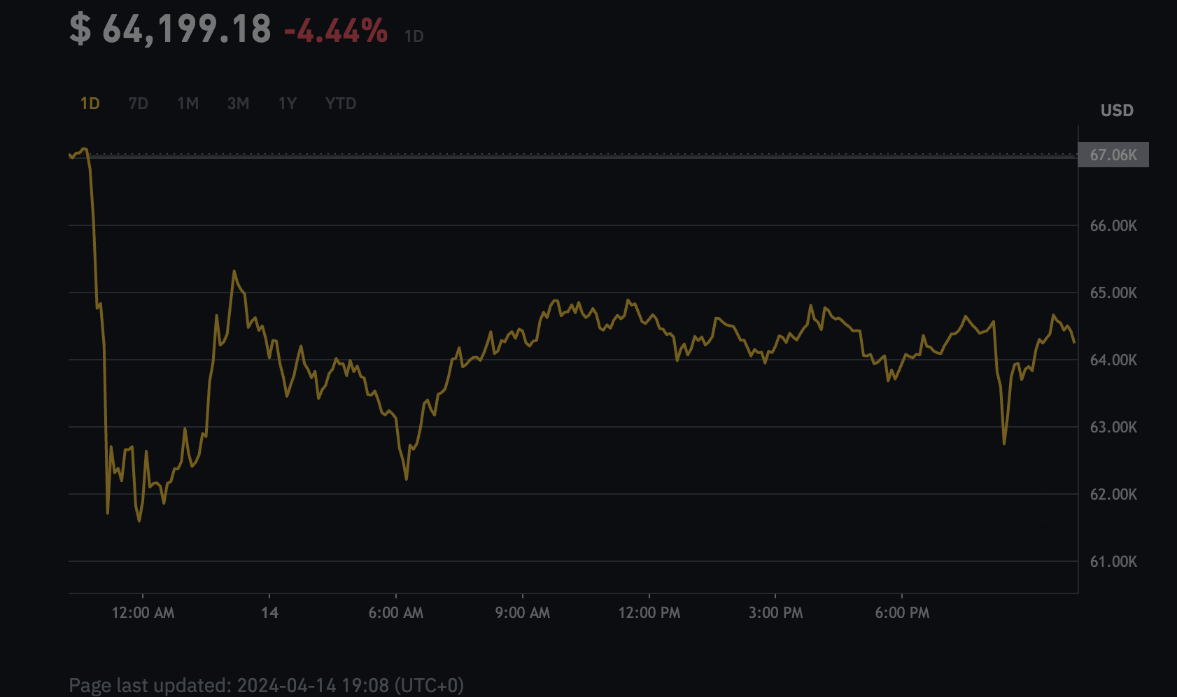İran'ın İsrail'e saldırısının ardından ilk tepki olarak yüzde 7 değer kaybeden Bitcoin bir miktar toparlanarak 64,199 dolara kadar çıktı. En yüksek ikinci işlem hacimli kripto para birimi Ethereum da değer yitirdi.