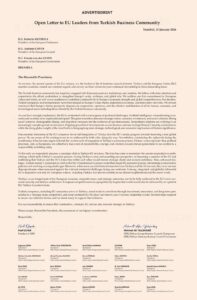 DEİK Avrupa İş Konseyleri Koordinatör Başkanı Mehmet Ali Yalçındağ ve 26 Avrupa ülkesinin İş Konseyi Başkanları, AB liderlerine bu amaçla bir mektup yazdı. Mektup bugünkü Financial Times gazetesinde de tam sayfa bir ilan olarak yayınlandı.