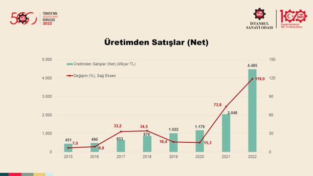 2022 yılında üretimden satışlara göre en büyük kuruluş 418,4 milyar liralık satışlarıyla TÜPRAŞ oldu. İstanbul Sanayi Odası (İSO) tarafından bu yıl 55’incisi düzenlenen “Türkiye’nin 500 Büyük Sanayi Kuruluşu Araştırması-2022” sonuçları açıklandı. İSO 500’de üretimden satışlar 2022 yılında yüzde 119 oranında artarak 2 trilyon 48 milyar liradan 4 trilyon 485 milyar liraya çıktı. İSO Başkanı Erdal Bahçıvan yüksek oranlı artışta, ihracattaki güçlü performansın yanı sıra canlı yurt içi talep, yükselen kur ve fiyatlar ile ihracat gelirlerinin TL karşılıklarındaki artışın belirleyici rol oynadığını söyledi.