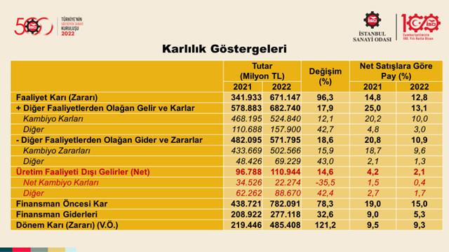 -İSO 500’ün 2022’de faaliyet kârı yüzde 96 oranında artarak 342 milyar liradan 671 milyar liraya çıktı.