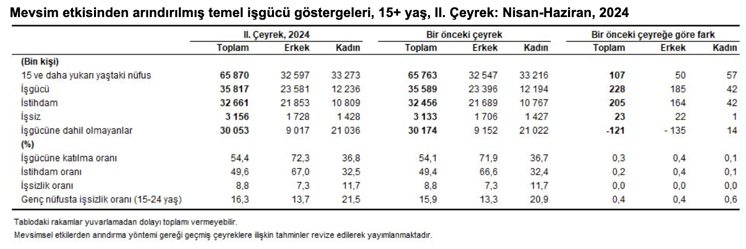 Yılın ikinci çeyreğinde mevsim etkisinden arındırılmış istihdam oranı yüzde 49,6 olurken, ekonominin istihdam yaratmakta zorlanmaya devam ettiği görüldü. Türkiye ekonomisi turizm sezonunun başladığı yılın ikinci çeyreğinde üç ayda çoğu hizmet sektöründe olmak üzere yalnızca 205 bin istihdam yaratabildi. 2024 yılı ikinci çeyreğinde istihdam edilenlerin sayısı 32 milyon 661 bin kişi, istihdam oranı ise 0,2 puanlık artış ile yüzde 49,6 oldu. Bu oran erkeklerde yüzde 67,0 iken kadınlarda yüzde 32,5 olarak gerçekleşti. Mevsim etkisinden arındırılmış işgücüne katılma oranı yüzde 54,4 olarak gerçekleşti İşgücü 2024 yılı ikinci çeyreğinde bir önceki çeyreğe göre 228 bin kişi artarak 35 milyon 817 bin kişi, işgücüne katılma oranı ise 0,3 puanlık artış ile yüzde 54,4 olarak gerçekleşti. İşgücüne katılma oranı erkeklerde yüzde 72,3, kadınlarda ise yüzde 36,8 oldu.