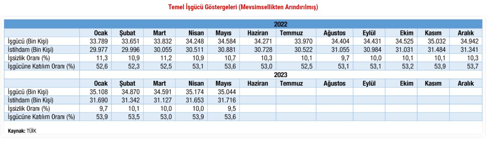 Zamana bağlı eksik istihdam, potansiyel işgücü ve işsizlerden oluşan âtıl işgücü oranı mayısta bir önceki aya göre 1,2 puanlık azalış ile yüzde 22,5 oldu. Türkiye İstatistik Kurumu’nun (TÜİK) mayıs ayına ilişkin işgücü istatistikleri de işgücü piyasasında yaklaşık son 1.5 yıldır iniş ve çıkışların devam ettiğini gösterdi. TÜİK’e göre mayısta dar tanımlı işsiz sayısı bir önceki aya göre 193 bin kişi azalarak 3 milyon 328 bin kişi oldu. Dar tanımlı işsizlik oranı 0,5 puan azalışla yüzde 9,5 seviyesinde gerçekleşerek 2014 yılının mart ayından bu yana yani son 9 yılın en düşük seviyesine geriledi. Geniş tanımlı işsizlik ise yüzde 22,5 oldu. İşsizlik oranı erkeklerde yüzde 7,7 iken kadınlarda yüzde 13,0 olarak tahmin edildi. Ancak Türkiye ekonomisi mayısta ise yalnızca 63 bin yeni istihdam yaratabildi.