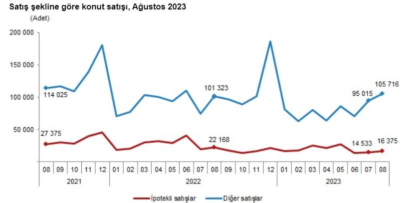 Türkiye genelinde ipotekli konut satışları ağustos ayında bir önceki yılın aynı ayına göre yüzde 26,1 azalış göstererek 16 bin 375 oldu. Toplam konut satışları içinde ipotekli satışların payı yüzde önceki aya sınırlı bir şekilde artarak 13,4 olarak gerçekleşti. Ocak-Ağustos döneminde gerçekleşen ipotekli konut satışları ise bir önceki yılın aynı dönemine göre yüzde 28,0 azalışla 152 bin 438 oldu. Ağustos ayında 3 bin 762 birinci el, ocak-ağustos döneminde ise 46 bin 89 birinci el konut ipotekli olarak satıldı.