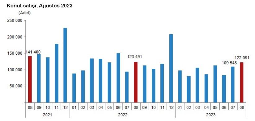 Yabancılara yapılan konut satışları ağustos ayında bir önceki aya göre yüzde 9 artarken, geçen yılın aynı ayına göre yüzde 42,0 azalarak 3 bin 58 oldu. Türkiye genelinde konut satışları ağustos ayında temmuz göre yüzde 11 artarak 122 bin 91’e çıktı. Bu rakam 2023’ün en yüksek satış verisi oldu. Sektör uzmanlarına göre, bu artışta İstanbul’da ayyuka çıkan fiyat artışlarından korkan Anadolu’nun benzer sondan korkup harekete geçmesi etkili oldu. Ayrıca kredi kısıtlamasının etkisiyle talebin öne çekilmesinin de ağustos ayında satış rekoru getirdiği belirtiliyor. Diğer taraftan rakam 2023’ün en yüksek satış verisi olsa da, konut satışları hem 12 alık dönemde hem de bu yılın 8 aylık döneminde düştü. Türkiye İstatistik Kurumu (TÜİK) verilerine göre, 12 aylık dönemde satışlarda yüzde 1.1 azalma yaşanırken, ocak-ağustos döneminde bir önceki yılın aynı dönemine göre de ev satışları yüzde 15,5 azalışla 797 bin 418 oldu.