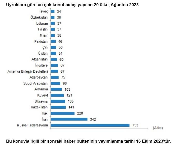Ülke uyruklarına göre en çok konut satışı Rusya Federasyonu vatandaşlarına yapıldı. Ağustos ayında Rusya Federasyonu vatandaşları Türkiye’den 733 konut satın aldı. Rusya Federasyonu vatandaşlarını sırasıyla 342 konut ile İran, 220 konut ile Irak ve 141 konut ile Kazakistan vatandaşları izledi.