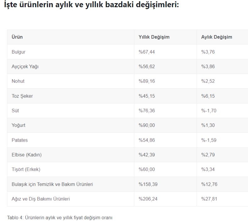 Temel tüketim maddelerinin bir önceki yılın haziran ayına göre fiyat artışlarına bakıldığında çarpıcı fiyat artışları göze çarptı. Ağız ve diş bakımı ürünleri yıllık bazda yüzde 206,24 ve aylık yüzde 27,81 artarken bulaşık için temizlik ve bakım ürünleri yıllık yüzde 158,39, aylık yüzde 12,76 arttı. Yoğurt fiyatları bir yılda yüzde 90 zamlanırken aylık bazda değişim yüzde 1,30 oldu. Nohut fiyatlarında ise yıllık bazda yüzde 89,16 artış yaşandı. Aylık artış yüzde 2,52 oldu. Süt fiyatlarındaki yıllık değişim ise yüzde 76,36.