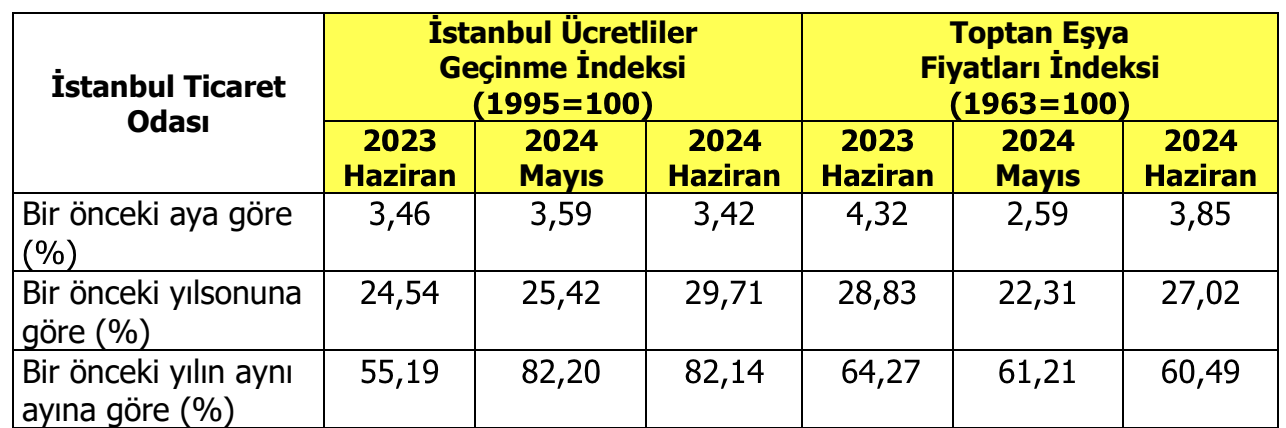 2023 Haziran ayına göre 2024 Haziran ayındaki fiyat değişimlerini gösteren bir önceki yılın aynı ayına göre değişim oranı İstanbul Ticaret Odası’nın (İTO) 1995 bazlı Ücretliler Geçinme İndeksinde yüzde 82,14, Toptan Eşya Fiyatları İndeksinde ise yüzde 60,49 olarak gerçekleşti. İTO’ya göre İstanbul’da mayısta aylık enflasyon yüzde 3,59, yıllık yüzde 82,20 olmuştu.