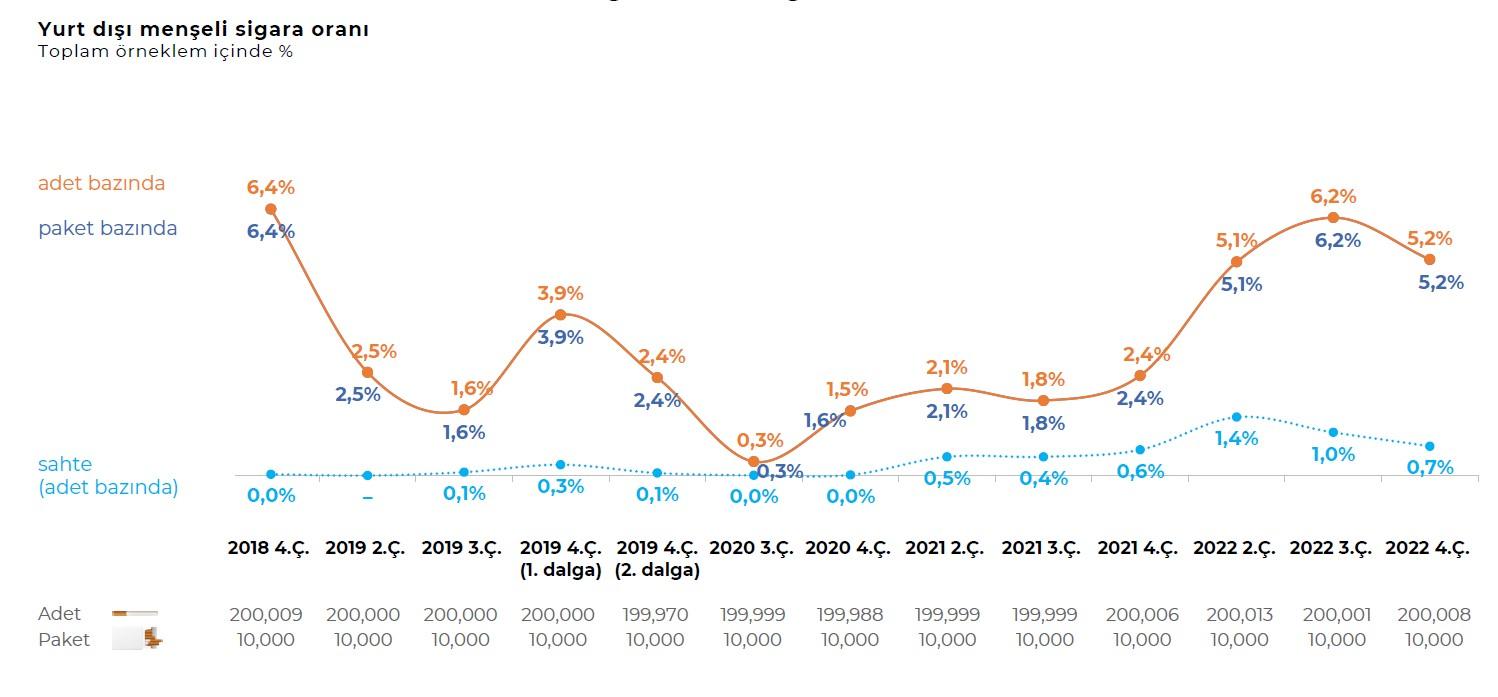 Nielsen tarafından 2022 yılının son çeyreğinde Türkiye nüfusunun yüzde 53’ünü kapsayan 36 şehirde yapılan ve British American Tobacco, Japan Tobacco International ve Philip Morris tarafından finanse edilen araştırmada yurtdışı menşeli kaçak oranı yüzde 5.2 çıktı. Araştırma yapılmak üzere toplanan paketlerin yüzde 0,7’sinin ise ankete katılan şirketlerin markalarının sahteleri olduğu görüldü. Yapılan araştırmaya göre göre kaçak sigara oranının en yüksek olduğu şehir yüzde 36 ile Şanlıurfa. Bu şehri yüzde 15.3 ile Van, yüzde 15 ile Antakya izliyor.