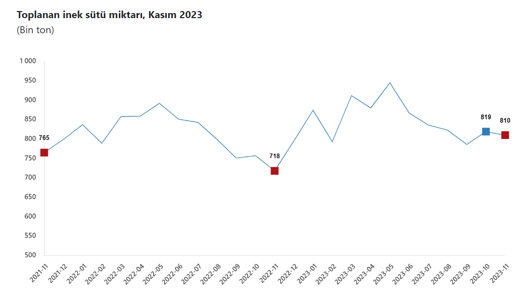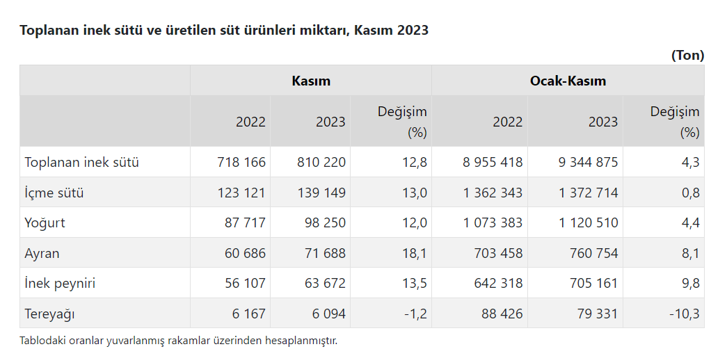 Kasım ayında bir önceki yılın aynı ayına göre inek peyniri üretimi yüzde 13,5, ayran üretimi yüzde 18,1, yoğurt üretimi yüzde 12,0, içme sütü üretimi yüzde 13,0 arttı, tereyağı üretimi yüzde 1,2 azaldı. Ocak-kasım döneminde ise bir önceki yılın aynı dönemine göre inek peyniri üretimi yüzde 9,8, ayran üretimi yüzde 8,1, yoğurt üretimi yüzde 4,4, içme sütü üretimi yüzde 0,8 arttı. Tereyağı üretimi ise yüzde 10,3 azaldı.
