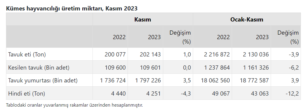Kasım ayında bir önceki yılın aynı ayına göre, tavuk yumurtası üretimi yüzde 3,5 arttı, kesilen tavuk sayısı yüzdesel olarak değişmedi, tavuk eti üretimi yüzde 1,0 arttı, hindi eti üretimi yüzde 4,3 azaldı. Ocak-kasım döneminde bir önceki yılın aynı dönemine göre, tavuk yumurtası üretimi yüzde 3,9 arttı, kesilen tavuk sayısı yüzde 6,2, tavuk eti üretimi yüzde 3,9, hindi eti üretimi yüzde 12,2 azaldı.