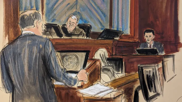 Fotoğraf çekmenin yasak olduğu mahkeme salonunda çizilen illüstrasyonda Sam Bankman Fried (karşıda sağda) avukatı Mark Cohen (solda) tarafından yargıç Lewis Kaplan’ın huzurunda sorgulanıyor.