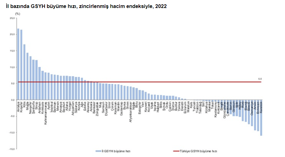 Yıllık GSYH zincirlenmiş hacim endeksiyle 2022’de önceki yıla göre yüzde 5,5 artarken 26 ilde Türkiye ortalamasının üzerinde artış gerçekleşti. Bir önceki yıla göre 2022’de en yüksek artış gösteren ilk üç il sırasıyla yüzde 21,8 değişim oranı ile Antalya, yüzde 21,4 ile Kırşehir ve yüzde 17 ile Kilis oldu. Bir önceki yıla göre en yüksek azalış gösteren üç il ise sırasıyla yüzde 9,4 ile Artvin, yüzde 9,5 ile Erzincan ve yüzde 11 ile Karabük olarak kayıtlara geçti.