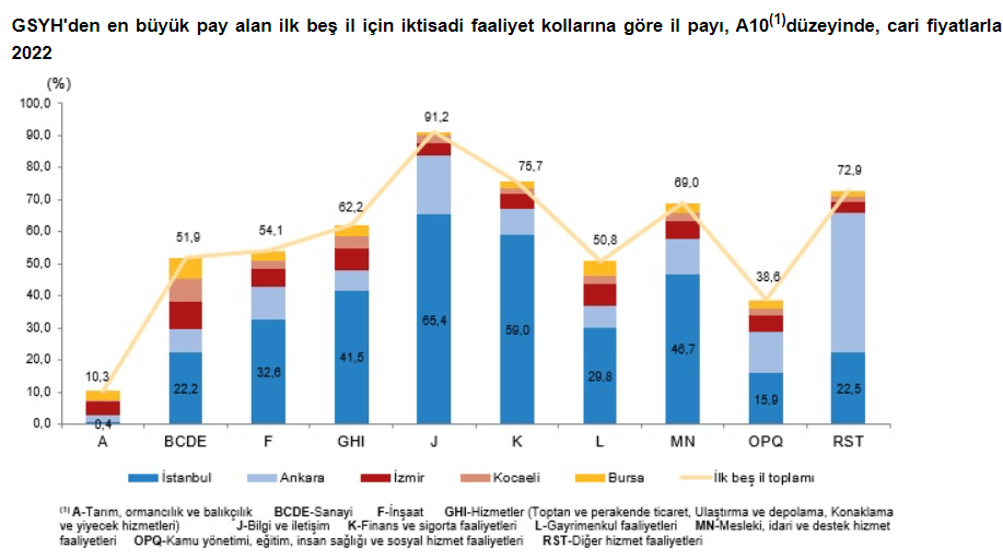 Konya yüzde 6,2 pay ile tarım, ormancılık, balıkçılık sektöründe 81 il içinde ilk sırada bulunurken Ankara yüzde 43,4 pay ile diğer hizmet faaliyetlerinde ilk sıraya yerleşti. İstanbul 2022’de hizmetler sektörü toplamından yüzde 41,5 pay alırken ilin toplam GSYH’si içinde hizmetler sektörünün payı yüzde 36,5 oldu. İstanbul’un toplam GSYH’si içinde sanayi sektörü yüzde 19,3 pay ile ikinci sırada; mesleki, idari ve destek hizmet faaliyetleri yüzde 7 pay ile üçüncü sırada yer aldı.