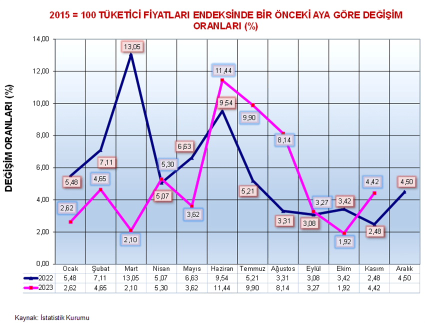 Kasımda bir önceki aya göre endekste kapsanan 593 maddenin ortalama fiyatlarında artış, 41 maddenin ortalama fiyatlarında ise düşüş oldu. Fiyatı en çok artan ilk üç ürün yüzde 61,25 ile numaralı kontakt lens, yüzde 55,48 ile dijital kamera ve yüzde 50,79 ile çift kişilik kanepe ve çekyat oldu. Fiyatı en çok düşen ilk üç ürün ise yüzde 44,04 ile patlıcan, yüzde 39,51 ile kabak ve yüzde 38,36 ile taze fasulye oldu.