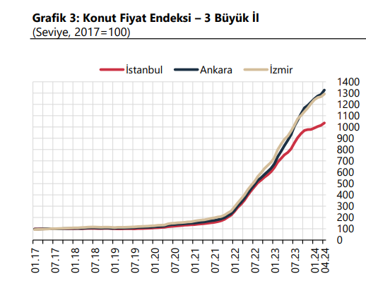 Konut fiyatları Türkiye genelinde yıllık yüzde 48,4 artarken İstanbul’da yüzde 37,6, Ankara’da yüzde 58,9, İzmir’de yüzde 45,1 artış gösterdi.