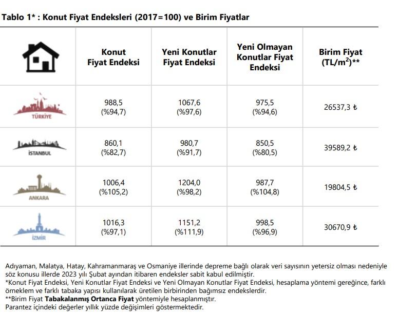 Ankara'daki kira artış oranı yüzde 1120,76 oldu. Ankara’yı yüzde 843,80 ile İstanbul, yüzde 801,23 ile İzmir takip etti. Türkiye genelinde konut fiyatları temmuz ayında uzun süreden beri ilk kez enflasyonun altında arttı. Türkiye Cumhuriyet Merkez Bankası (TCMB) tarafından yayınlanan Temmuz 2023 dönemine ilişkin Konut Fiyat Endeksi (KFE) verilerine göre, konutların kalite etkisinden arındırılmış fiyat değişimlerini izlemek amacıyla hesaplanan KFE (2017=100), temmuzda bir önceki aya göre yüzde 7,3 artarak 988,5 seviyesinde gerçekleşti. 2023 Temmuz ayında TÜFE’deki (Tüketici Fiyat Endeksi) artış 9,49 olarak gerçekleşmiş ve Temmuz ayı son 18 yılın en pahalı temmuzu olmuştu. TKFE, temmuzda yıllık bazda yüzde 94,7 artarken, bu dönemde reel yükseliş yüzde 31,2 oldu. 2023 yılı Haziran ayında bir önceki aya göre yüzde 4,8 oranında artan KFE, bir önceki yılın aynı ayına göre nominal olarak yüzde 95,9, reel olarak ise yüzde 38,0 oranında artış göstermişti.