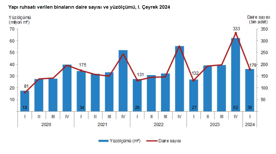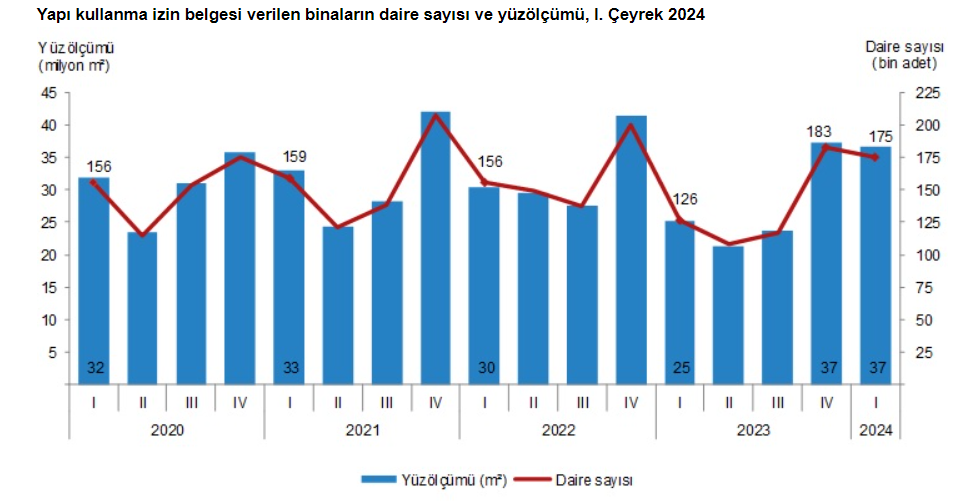 Bir önceki yılın aynı çeyreğine göre, 2024 yılı 1’inci çeyreğinde belediyeler tarafından yapı kullanma izin belgesi verilen yani tamamlanan bina sayısı yüzde 41,2, daire sayısı yüzde 38,5 ve yüzölçüm yüzde 45,3 arttı. Belediyeler tarafından 2024 yılı 1’inci çeyreğinde yapı kullanma izin belgesi verilen binaların toplam yüzölçümü 36,7 milyon metrekare iken, bunun 19,9 milyon metrekaresi konut, 8,9 milyon metrekaresi konut dışı ve 7,9 milyon metrekaresi ise ortak kullanım alanı olarak gerçekleşti. Yapı kullanma izin belgesi verilerek tamamlanan konutların 25,2 milyon metrekaresi iki ve daha fazla daireli olurken, 2,5 milyon metrekaresi ise bir daireli binalar oldu.