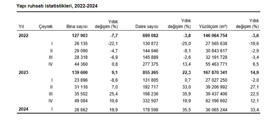 Deprem sonrası başlayan yeni konut yapımı ve kentsel dönüşümün hızlanmasıyla konut sektörü hareketlendi. 2024'ün ilk çeyreğinde yapı ruhsatı verilen bina sayısı yüzde 19,9 artarken, tamamlanan bina sayısı da yüzde 41,2 artış gösterdi.