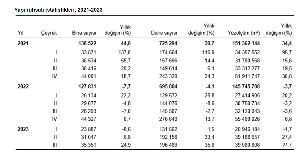 Türkiye İstatistik Kurumu (TÜİK) 2023 yılının üçüncü çeyreğine ilişkin yapı izin istatistiklerini açıkladı. Buna göre, söz konusu dönemde yıllık bazda belediyeler tarafından yapı ruhsatı verilen bina sayısı yüzde 24,9, daire sayısı yüzde 35 ve yüz ölçümü yüzde 21,7 arttı. Yapı ruhsatı verilen yapıların toplam yüz ölçümü 39,1 milyon metrekare olurken bunun 21 milyon metrekaresinin konut, 10 milyon metrekaresinin konut dışı ve 8,1 milyon metrekaresinin ise ortak kullanım alanı olduğu görüldü.