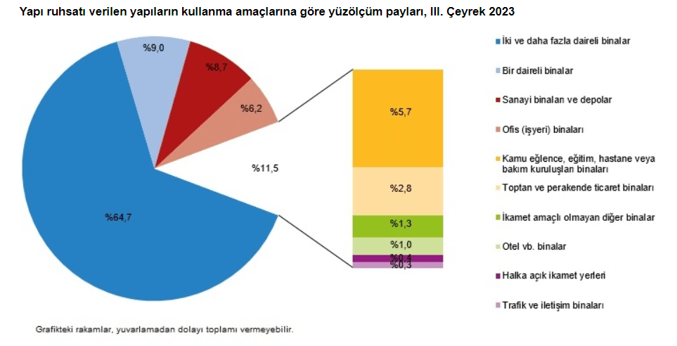 Kullanma amacına göre en yüksek pay 25,3 milyon metrekareyle 2 ve daha fazla daireli ikamet amaçlı binaların oldu. Bunu 3,5 milyon metrekareyle bir daireli binalar izledi. Yapı ruhsatı alınan binalar içinde müstakil konutların payı pandemi öncesinde yüzde 3 iken, pandemi ve deprem korkusuyla başlayan ilgi nedeniyle 3’üncü çeyrekte yüzde 9’a çıktı.