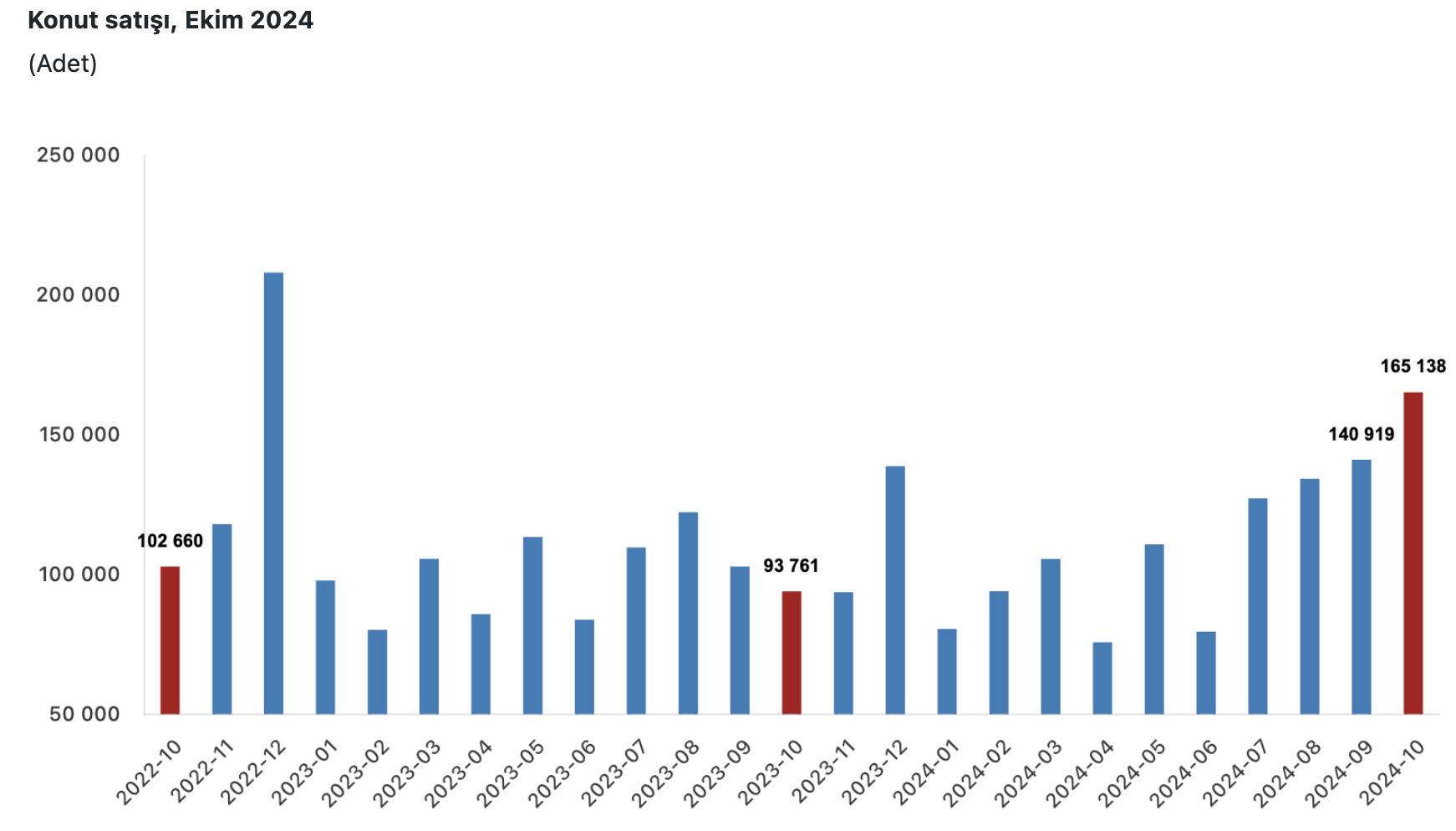 Türkiye İstatistik Kurumu’na (TÜİK) göre ekim ayında Türkiye genelinde konut satışları bir önceki yılın aynı ayına göre yüzde 76,1; bir önceki aya göre de yüzde 17,1 oranında artarak 165 bin 138’e ulaştı. Ekim ayı verileri konut satışlarında 2024 haziran ayında başlayan ancak eylülde hız kesme belirtileri gösteren artışın ivmelenerek devam ettiğini gösteriyor.