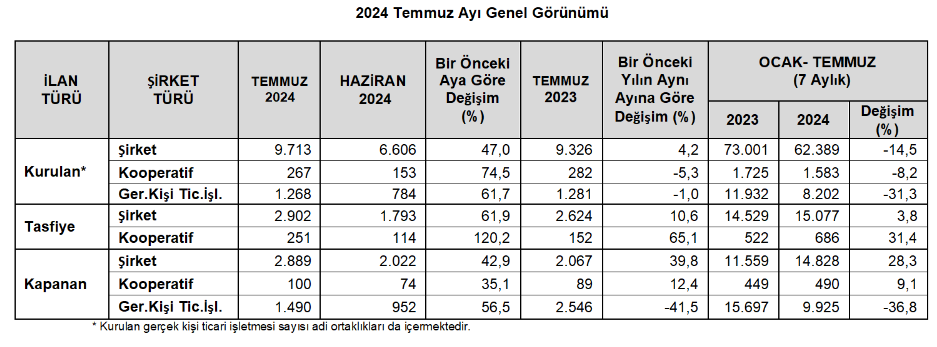 Temmuzda geçen yılın aynı ayına göre kapanan şirket sayısı yüzde 39,8 arttı. Temmuz 2023’te 2 bin 67 şirket kapanmıştı. Bu dönemde kapanan kooperatif sayısı yüzde 12,4 artarken, kapanan gerçek kişi ticari işletme sayısında yüzde 41,5 azalış gerçekleşti.